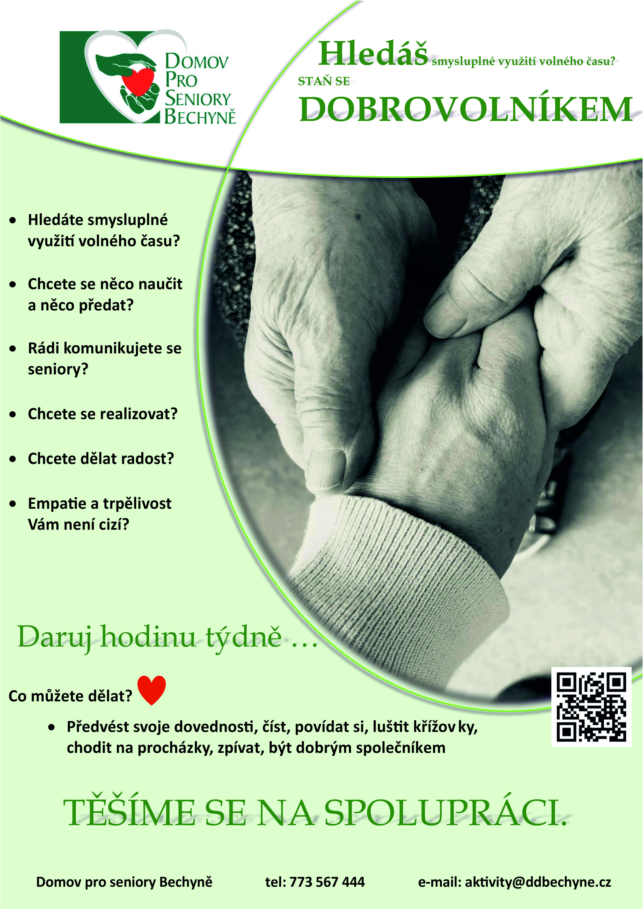 Hledáte smysluplné využití volného času? Rádi komunikujete se seniory? Chcete dělat radost? Empatie a trpělivost Vám není cizí? Darujte hodinu týdně a staňte se DOBROVOLNÍKEM.